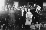Description :LES MEMBRES DE LA FAMILLE DE NAPOLEON CADORETTE POSENT A L'EXTERIEUR DE LEUR MAISON. NAPOLEON CADORETTE EST A L'EXTREME DROITE ET PORTE SA FILLE LINA DANS SES BRAS. SA FEMME, PHILOMENE RIENDEAU EST A SA DROITE. IL Y A LES 14 ENFANTS CADORETTE ...