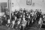 Description :INTERIEUR D'UNE SALLE DE COURS. L'INSTITUTRICE EST AU FOND. LES ELEVES SONT 35 GARCONS. TOUS REGARDENT L'APPAREIL PHOTO SAUF UN A GAUCHE. LA SALLE A UNE COLONNE AU MILIEU. LES CHAISES SONT POUR TROIS ENFANTS ET ELLES PORTENT UNE CROIX. LES ENF...