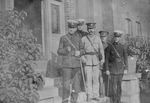 Description :CINQ MILITAIRES SONT SUR LES MARCHES D'UN ESCALIER A L'ENTREE D'UN BATIMENT. LA COULEUR DE LEURS UNIFORMES EST DIFFERENTE. CERTAINES CASQUETTES SONT COUVERTES D'UNE PROTECTION CONTRE LA PLUIE EN PLASTIQUE BLANC.