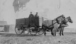 Description :DEUX HOMMES SONT SUR UNE VOITURE TIREE PAR DES CHEVAUX. ILS SONT DANS UN CHAMP AGRICOLE APRES LA RECOLTE. EN ARRIERE, A GAUCHE, INSTALLATIONS D'UNE FERME.
