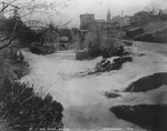 Description :LA RIVIERE MAGOG A PARTIR DE LA RIVE PRES DU BARRAGE DE LA CENTRALE FRONTENAC. ON APERCOIT LA CENTRALE SUR LA GAUCHE AINSI QUE LE BATIMENT DE LA SHERBROOKE LAUNDRY, QUELQUES MAISONS ET LE CLOCHER DE L'EGLISE ST.ANDREW SUR LA DROITE.