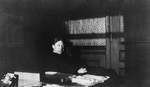 Description :M. SAUNDERS PRENANT LA POSE, ASSIS SUR UN TABOURET ELEVE, DEVANT UN BUREAU A TIROIRS ET SURFACE INCLINEE AU-DESSUS DE LAQUELLE UN ABAT-JOUR EST SUSPENDU; AU MUR, DIFFERENTS RANGEMENTS. A GAUCHE, UN TELEPHONE EST FIXE SUR UN PANNEAU PIVOTANT, C...