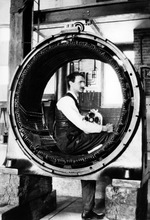 Description :A.W. SAUNDERS PRENANT LA POSE, ASSIS DANS UNE PIECE DE METAL USINEE, DE FORME CYLINDRIQUE.