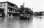 Description :VUE SUR LA RUE WELLINGTON SUD PRES DU PONT FERROVIAIRE LORS DE L'INONDATION DE 1942. DES SOLDATS PRENNENT PLACE A L'INTERIEUR D'UNE CAMIONNETTE OUVERTE. UN COMMERCE DE FOURRURES BURTES EST ANNONCE SUR LA MAISON A L'ARRIERE