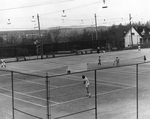 Description :VUE SUR LE TERRAIN DE TENNIS OU QUELQUES JOUEURS SONT A DISPUTER UN MATCH. A L'ARRIERE-PLAN, MONTAGNES DE STOKE AVEC, UN PEU VERS LA GAUCHE, LE CEGEP DE SHERBROOKE.