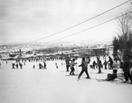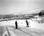 Description :VUE GLOBALE DE LA PISTE DE SKI AVEC A L'AVANT-PLAN, DES SKIEURS. AU CENTRE, DE GAUCHE A DROITE : LE STATIONNEMENT, LE CHALET ET LE TERRAIN DE TENNIS. A L'ARRIERE-PLAN, LA VILLE DE SHERBROOKE.
