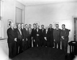 Description :EMPLOYES PRENANT LA POSE DEVANT UNE PHOTO GEANTE DU PLAN DE LA RAND SHERBROOKE. A DROITE DE CELLE-CI, UNE CLEF EST FIXEE AU MUR. PREMIERE RANGEE, DE GAUCHE A DROITE: M. WALLIS; FRANK CLARK; TED HARBERT; M. MAY; M. LAGIE; M. BYRD. DEBOUT, DE G...