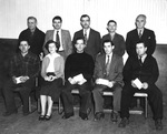 Description :OFFICIERS AYANT MERITE UNE RECOMPENSE ET RECIPIENDAIRES D'UN PRIX DE PRESENCE PRENANT LA POSE DANS LE LOCAL DU PETIT THEATRE. AU PREMIER PLAN, DE GAUCHE A DROITE: ANDRE POULIN, 1ER OFFICIER AYANT MERITE 25.00$; NAOMI DIX, 10.00$; GILBERT YOUNG...