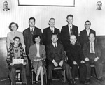 Description :OFFICIERS AYANT MERITE UNE RECOMPENSE ET RECIPIENDAIRES D'UN PRIX DE PRESENCE PRENANT LA POSE DANS LE LOCAL DU PETIT THEATRE. AU PREMIER PLAN, DE GAUCHE A DROITE: J.T. CARBONNEAU 1ER OFFICIER AYANT MERITE 25.00$; MARGARET FOY, 10.00$; LEONARD ...