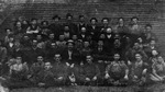 Description :GROUPE DE TRAVAILLEURS DE LA RAND PRENANT LA POSE DEVANT LA VOUTE DU RESERVOIR A L'HUILE SITUE ENTRE L'EDIFICE NO. 1 (ASSEMBLAGE) ET L'EDIFICE NO. 3 (JACK DRILL SHOP).