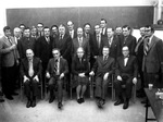 Description :EMPLOYES PRENANT LA POSE DEVANT UN LARGE TABLEAU. CERTAINS SONT IDENTIFIES AU VERSO. DE GAUCHE A DROITE, PREMIERE RANGEE: ART BRITTON; ERIC CLARK; JESSIE HOPKINS; BERGERON; JOHN KNOX.
