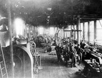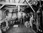 Description :VUE INTERIEURE DE LA CANADIAN RAND DRILL. EMPLOYES PRENANT LA POSE. ENCHEVETREMENT DE POULIES ET COURROIES. AU PREMIER PLAN, DE GAUCHE A DROITE: BERT SAUNDERS; ? NATHBRIDGE; WILLIAM COOGAN. ALORS QUE SAUNDERS EST UN OUVRIER, LES DEUX AUTRES SE...