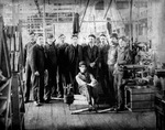 Description :INTERIEUR DE LA JENCKES MACHINE COMPANY. GROUPE D'EMPLOYES DE LA TOLERIE PRENANT LA POSE. A NOTER L'ECHELLE, AU SECOND PLAN; ELLE DONNAIT ACCES A LA CONSTRUCTION SURELEVEE, DE FORME CUBIQUE, SERVANT DE BUREAU D'ADMINISTRATION, SITUEE A HUIT PI...