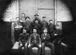 Description :VUE DE L'ARRIERE DE L'ATELIER DE FORGE. ONZE EMPLOYES PRENANT LA POSE.
