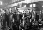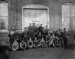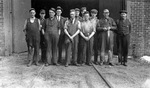 Description :EMPLOYES PRENANT LA POSE A L'ARRIERE DE L'EDIFICE NUMERO 1; A NOTER, LES DEUX RAILS DE METAL PENETRANT DANS L'EDIFICE. PREMIERE RANGEE, DE GAUCHE A DROITE: UN INCONNU; GEORGES DUBOIS; STAN ODELL; CHARLIE LAMONTAGNE; BERT JONES; JOHN MCLEAN. DE...