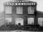 Description :VUE INTERIEURE DE LA CANADIAN RAND DRILL CO. EMPLOYES PRENANT LA POSE: BERT SAUNDERS, SIXIEME A PARTIR DE LA GAUCHE. A REMARQUER, A L'AVANT-PLAN, DEUX BURINS PNEUMATIQUES.
