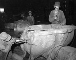 Description :OUVRIERS MUNIS DE BURINS PNEUMATIQUES ET DE LUNETTES PROTECTRICES S'AFFAIRANT A NETTOYER LA PARTIE INFERIEURE D'UNE POMPE CENTRIFUGE CAMERON 24ALV. CETTE POMPE COULEE A LA FONDERIE DE LA RAND A ETE FABRIQUEE POUR ETRE UTILISEE DANS DES MINES D...