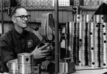 Description :INTERIEUR DE LA FONDERIE SOUS DIFFERENTS ANGLES. 40.1 - EMILE LABRECQUE FOULANT LE SABLE DANS UNE BOITE ®CENTRE D'UN CYLINDRE¯. DERRIERE LUI, BROUETTES REMPLIES DE SABLE. 40.2 - VUE GENERALE DE LA FONDERIE OU QUELQUES EMPLOYES S'AFFAIRENT:...