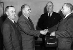 Description :MEMBRES DU CONSEIL D'ADMINISTRATION DE LA L.S.A. PRENANT LA POSE AU MOMENT DE LA REMISE D'UN APPAREIL DE RADIO PORTATIF. DE GAUCHE A DROITE: J. FOURNIER, VICE-PRESIDENT; CLARENCE BEATON; BOB WHATLEY, PRESIDENT; BOB COMPAGNAT.