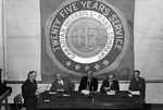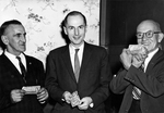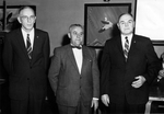 Description :AU PREMIER PLAN, TROIS RECIPIENDAIRES DE LA RECOMPENSE (SOIT UN BOUTON) PRENANT LA POSE. DE GAUCHE A DROITE: HAROLD MCCULLOGH, 35 ANS DE SERVICE; J. FOURNIER, 40 ANS DE SERVICES; NON IDENTIFIE, 45 ANS DE SERVICES. DERRIERER, TABLEAUX REPRESEN...