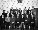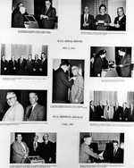 Description :VUE DE LA CAFETERIA DE LA RAND OU LES MEMBRES DE LA L.S.A. ET LES MEMBRES A VIE PRENNENT LA POSE. LES MEMBRES A VIE PORTENT UNE MEDAILLE EN PLUS DU BOUTON A LEUR BOUTONNIERE; ILS SONT, EN AVANT A L'EXTREME DROITE: GEORGE LOTHROP ET, DEBOUT, DE...