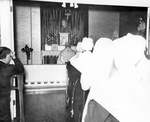 Description :VUE A PARTIR DE L'ASSISTANCE DE L'AUTEL DE LA CHAPELLE OU EST EXPOSE UN OSTENSOIR. LE PRETRE PORTANT CHASUBLE EST AGENOUILLE DEVANT L'AUTEL. ON DISTINGUE DANS L'ASSISTANCE QUATRE RELIGIEUSES ET UN HOMME.