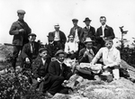 Description :A.W. SAUNDERS ASSIS DEVANT, UNE BOUTEILLE A LA MAIN, ENTOURE DE SES AMIS ET CONFRERES. CERTAINS SONT MUNIS DE JUMELLES. COMME L'UN DES JEUNES HOMMES PORTE UNE FLEUR A LA BOUTONNIERE, IL PEUT S'AGIR D'HOMMES PRESENTS A UN MARIAGE.