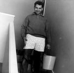 Description :LAURENT BIRON EST DEBOUT DANS DES ESCALIERS. IL TIENT UN SCEAU DANS LA MAIN DROITE. IL PORTE UN CHANDAIL, UNE PAIRE DE PANTALON ET UN BOXER PAR DESSUS SES PANTALONS.