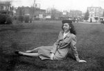 Description :CONNIE HNILICKA EST ASSISE SUR L'HERBE DANS UN PARC. ELLE PORTE UNE JUPE, UNE VESTE ET UN CHAPEAU. EN ARRIERE-PLAN, DES BATIMENTS ET A DROITE, UN MONUMENT.