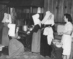 Description :DES RELIGIEUSES EN TABLIER S'AFFAIRENT DANS LA CUISINE AUTOUR DU POELE A BOIS. LA RELIGIEUSE A DROITE EN NOIR EST SOEUR AGATHE PROVOST. CELLE PRES DE L'ESCALIER EST SOEUR LOUIS-ALPHONSE (GERMAINE DESROCHERS). SOEUR BARTHELEMY (MARIE-LOUISE CAT...