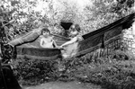 Description :DEUX JEUNES GARCONS ASSIS DANS UN HAMAC. CELUI DE GAUCHE EST ROGER BIRON ET CELUI DE DROITE JEAN-JACQUES BIRON. EN ARRIERE-PLAN, UN COSTUME DE BAIN SUR UNE CORDE A LINGE ET DES ARBRES.