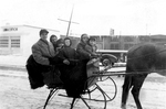 Description :UN HOMME, UNE ADOLESCENTE ET QUATRE GARCONS DANS UN SLEIGH DE STYLE ®PORTLAND CUTTER¯ TIRE PAR UN CHEVAL. DE GAUCHE A DROITE, LE CONDUCTEUR TENANT LES RENES, CONNIE HNILICKA, ROGER BIRON, HENRY HEATH, RICHARD (DICK) JACKSON ET JEAN-JACQUES B...