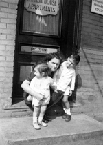 Description :11.1 - EXILIA EMOND EST AGENOUILLEE AU PIED D'UNE PORTE ET SERRE SES GARCONS JEAN-JACQUES ET LAURENT PRES D'ELLE. DANS LA FENETRE DE LA PORTE UNE AFFICHE INDIQUE "CANADA HOUSE APARTMENTS". DANS LE COIN SUPERIEUR, UNE AFFICHE INDIQUE LES TARIFS...