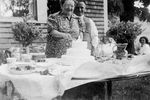 Description :MARGARET THERRIEN EST EN TRAIN DE COUPER UN GATEAU DE NOCES INSTALLE SUR UNE TABLE A L'EXTERIEUR. ELLE PORTE UNE ROBE FLEURIE ET A DES LUNETTES. DERRIERE ELLE, SON MARI. EN ARRIERE-PLAN, UNE MAISON ET UNE FEMME ASSISE. A NOTER, OUTRE LE GATEAU...