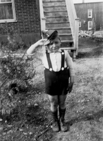 Description :16.1 - LAURENT BIRON EST PLACE DEVANT UN ESCALIER ET FAIT UN ESCALIER ET FAIT UN SALUT MILITAIRE. IL PORTE UN BERMUDA AVEC DES BRETELLES, UN GILET A BOUTONS ET UN BERET. EN ARRIERE-PLAN, A GAUCHE, UN BATIMENT EN BRIQUES. A DROITE, UNE RUELLE A...
