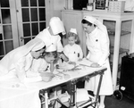 Description :DEUX INFIRMIERES, UNE RELIGIEUSE ET DEUX FILLETTES DEGUISEES EN GARDE-MALADES EXAMINENT DIVERS INSTRUMENTS DE MEDECINE DISPOSES SUR UNE TABLE RECOUVERTE D'UN DRAP BLANC. AU FOND, UN CABINET CONTENANT D'AUTRES INSTRUMENTS CHIRURGICAUX.