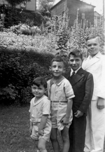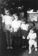 Description :27.1 - DE GAUCHE A DROITE, ROGER BIRON, JEAN-JACQUES BIRON, LAURENT BIRON ET DICK JACKSON. LES QUATRE JEUNES GARCONS SONT PLACES PAR ORDRE DE GRANDEUR. LES DEUX PREMIERS PORTENT DES CULOTTES COURTES ET UN T-SHIRT ALORS QUE LES DEUX DERNIERS PO...