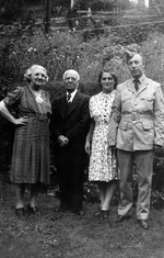 Description :28.1 - DE GAUCHE A DROITE, ALMA THERRIEN, SON EPOUX FREDERICK-ANTOINE BIRON, EXILIA EMOND ET SON EPOUX LEON BIRON EN COSTUME MILITAIRE. EN ARRIERE-PLAN, DE LA VEGETATION. 28.2 - JEAN-JACQUES EST ASSIS SUR LE GAZON SON PETIT FRERE ROGER ENTRE L...