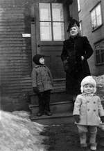 Description :29.1 - ALMA THERRIEN EST DEBOUT SUR L'ESCALIER QUI MENE A LA PORTE D'ENTREE. ELLE PORTE UN MANTEAU LONG ET UN CHAPEAU. A SA GAUCHE, SON PETIT-FILS JEAN-JACQUES BIRON AVEC UN MANTEAU, DES MITAINES ET UN BONNET. DEVANT, ROGER BIRON AVEC UN MANTE...