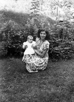 Description :CONNIE EST PENCHEE ET TIENT DANS SES BRAS LA PETITE PATTI QUI DOIT AVOIR QUELQUES MOIS. CONNIE PORTE UNE ROBE. DERRIERE ELLE, DE LA VEGETATION.