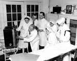 Description :SCENE DE LECTURE D'UN RAYON X SOUS LA DIRECTION DU DOCTEUR NOEL. TROIS INFIRMIERES, UNE RELIGIEUSE ET DEUX HOMMES FAISANT PARTIE DU PERSONNEL MEDICAL OBSERVENT LE NEGATIF SUR LEQUEL LE DR NOEL DESIGNE DES POINTS PARTICULIERS. A L'AVANT, UNE T...