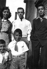Description :1ERE RANGEE, JEAN-JACQUES BIRON ET LAURENT BIRON. 2EME RANGEE, CONNIE HNILICKA, MARCEL BIRON ET GUY BIRON. A DROITE, UN BATIMENT. EN ARRIERE-PLAN, UNE CHEMINEE.