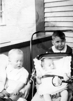 Description :DE GAUCHE A DROITE, GERALD HEATH DANS LES BRAS D'UNE FEMME, JEAN-JACQUES BIRON DANS SA POUSSETTE ET, DERRIERE, LAURENT BIRON. EN ARRIERE-PLAN, UN BATIMENT EN BOIS.