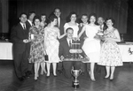 Description :MEMBRES DE L'EQUIPE DU SERVICE CIVIL FEDERAL POSANT AVEC LEUR TROPHEES. A GENOUX DEVANT LE GROUPE ET TENANT UN TROPHEE, ALBERT THERIAULT, CAPITAINE DE L'EQUIPE ET PRESIDENT DE LA LIGUE. EN ARRIERE-PLAN, DE GAUCHE A DROITE, LAURENT BIRON (MEILL...