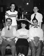 Description :1ERE RANGEE ASSISE SUR UN BANC, UN INCONNU, HELENE MATHIEU ET GASTON SAVARD. 2EME RANGEE DEBOUT, GEORGES O'NEIL ET RAYMOND METRAS. A NOTER, CES DEUX DERNIERS TIENNENT UN TROPHEE.