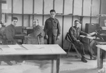 Description :CINQ MILITAIRES DANS UN BUREAU. DE GAUCHE A DROITE, LEO LAVIGNE, LEON BIRON, BERNARD SENNEVILLE, PAUL CARDINAL ET VALERE GAMACHE. DEVANT LEON BIRON, UNE MACHINE A ECRIRE. A DROITE, SUR UNE TABLE, CE QUI SEMBLE ETRE UNE PRESSE ROTATIVE. EN AVAN...