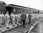 Description :DES SOLDATS SONT PLACES SUR DEUX RANGS. ILS PORTENT UNE CHEMISE, UN PANTALON ET UN BERET SUR LA TETE. DEVANT EUX, DEUX OFFICIERS AVEC LEUR HABIT ET LEUR CASQUETTE SONT DEBOUT SUR DES RAILS. EN ARRIERE-PLAN, DES WAGONS AVEC LA MENTION "CANADIAN...