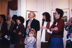 Description :UN HOMME, UNE FILLETTE ET UN GROUPE DE FEMMES REGARDENT DANS UNE DIRECTION. PARMI EUX, CELLES AVEC UNE COCARDE SONT LORRAINE FORTIER (A GAUCHE) ET CHANTAL ANGERS (A DROITE). EN ARRIERE-PLAN, DEUX TOILES.