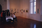 Description :2.1 - GROUPE D'INDIVIDUS EN TRAIN D'OBSERVER DES AQUARELLES. A DROITE, MICHEL DUPRE, PRESIDENT D'HONNEUR. 2.2 - GROUPE D'INDIVIDUS OBSERVANT DES AQUARELLES. PARMI EUX, CELUI AVEC LE CHANDAIL ROUGE EST MICHEL DUPRE. A DROITE, LORRAINE FORTIER D...