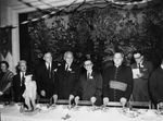 Description :NEUF HOMMES PRESENTS A LA TABLE D'HONNEUR LORS DU CONGRES. LE DEUXIEME EST DEBOUT ET PRONONCE UN DISCOURS. DE GAUCHE A DROITE: TROIS HOMMES INCONNUS, LUCIEN BEDARD, UN HOMME INCONNU, ARMAND NADEAU, MGR MAURICE O'BREADY, LE DEPUTE FEDERAL MAURI...